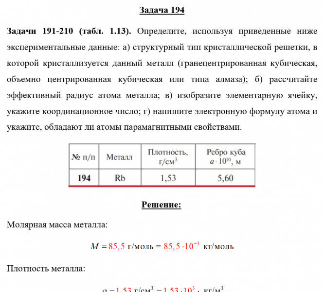 Задачи 191-210 (табл. 1.13). Определите, используя приведенные ниже экспериментальные данные: а) структурный тип кристаллической решетки, в которой кристаллизуется данный металл (гранецентрированная кубическая, объемно центрированная кубическая или типа алмаза); б) рассчитайте эффективный радиус атома металла; в) изобразите элементарную ячейку, укажите координационное число; г) напишите электронную формулу атома и укажите, обладают ли атомы парамагнитными свойствами..