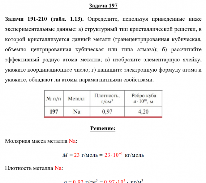 Задачи 191-210 (табл. 1.13). Определите, используя приведенные ниже экспериментальные данные: а) структурный тип кристаллической решетки, в которой кристаллизуется данный металл (гранецентрированная кубическая, объемно центрированная кубическая или типа алмаза); б) рассчитайте эффективный радиус атома металла; в) изобразите элементарную ячейку, укажите координационное число; г) напишите электронную формулу атома и укажите, обладают ли атомы парамагнитными свойствами.