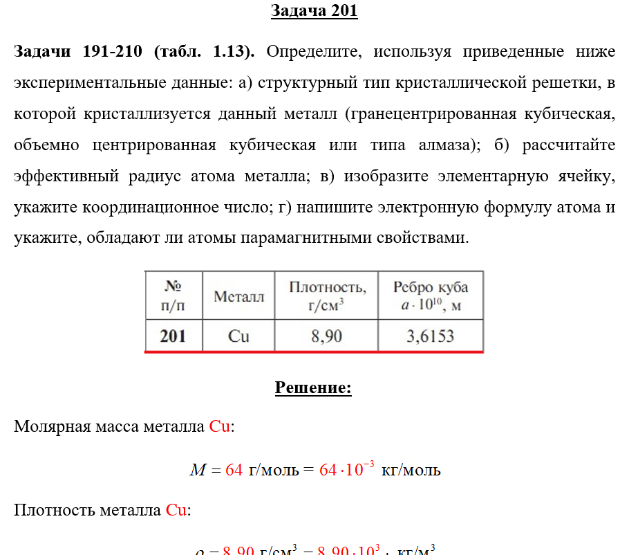 Задачи 191-210 (табл. 1.13). Определите, используя приведенные ниже экспериментальные данные: а) структурный тип кристаллической решетки, в которой кристаллизуется данный металл (гранецентрированная кубическая, объемно центрированная кубическая или типа алмаза); б) рассчитайте эффективный радиус атома металла; в) изобразите элементарную ячейку, укажите координационное число; г) напишите электронную формулу атома и укажите, обладают ли атомы парамагнитными свойствами.