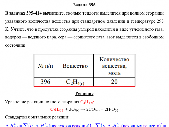 Задача 396 - вычислите, сколько теплоты выделится при полном сгорании указанного количества вещества при стандартном давлении и температуре 298 K. Учтите, что в продуктах50 сгорания углерод находится в виде углекислого газа, водород — водяного пара,