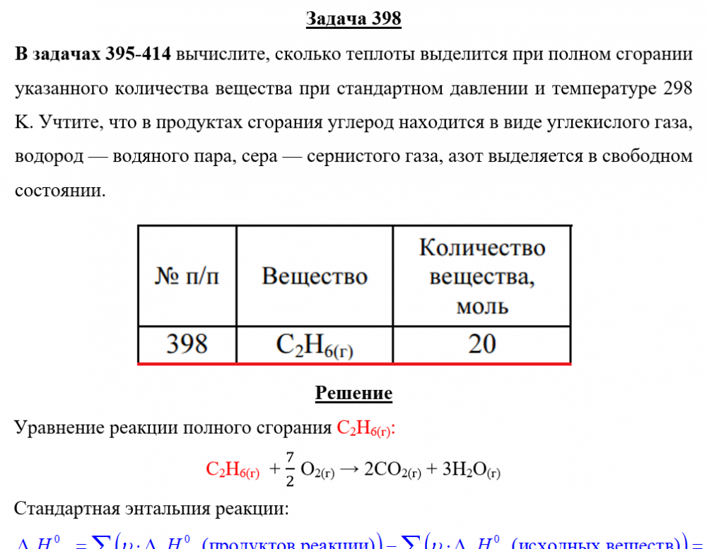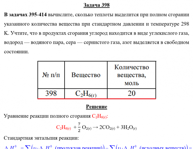 Задача 398 - вычислите, сколько теплоты выделится при полном сгорании указанного количества вещества при стандартном давлении и температуре 298 K. Учтите, что в продуктах50 сгорания углерод находится в виде углекислого газа, водород — водяного пара,