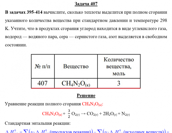 Задача 407 - вычислите, сколько теплоты выделится при полном сгорании указанного количества вещества при стандартном давлении и температуре 298 K. Учтите, что в продуктах50 сгорания углерод находится в виде углекислого газа, водород — водяного пара,