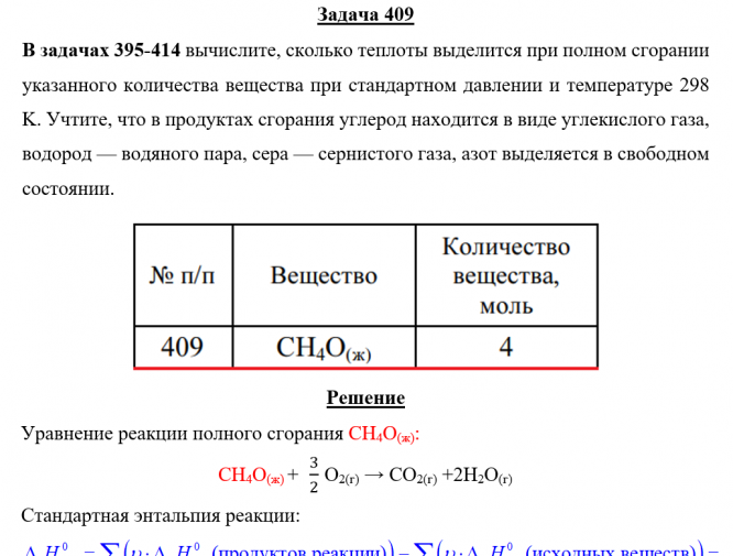 Задача 409 - вычислите, сколько теплоты выделится при полном сгорании указанного количества вещества при стандартном давлении и температуре 298 K. Учтите, что в продуктах50 сгорания углерод находится в виде углекислого газа, водород — водяного пара,