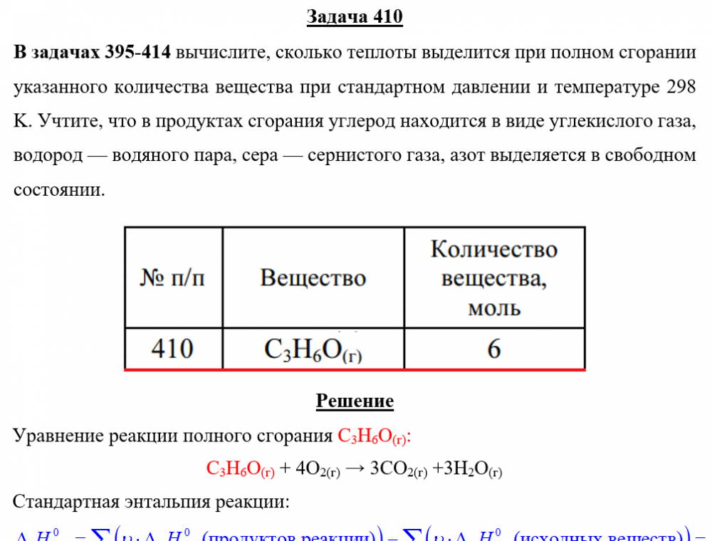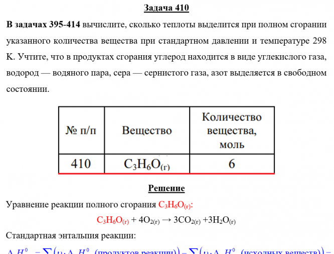 Задача 410 - вычислите, сколько теплоты выделится при полном сгорании указанного количества вещества при стандартном давлении и температуре 298 K. Учтите, что в продуктах50 сгорания углерод находится в виде углекислого газа, водород — водяного пара,