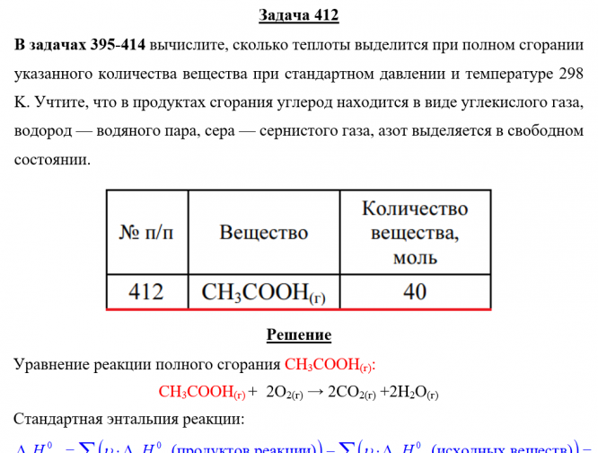 Задача 412 - вычислите, сколько теплоты выделится при полном сгорании указанного количества вещества при стандартном давлении и температуре 298 K. Учтите, что в продуктах50 сгорания углерод находится в виде углекислого газа, водород — водяного пара,