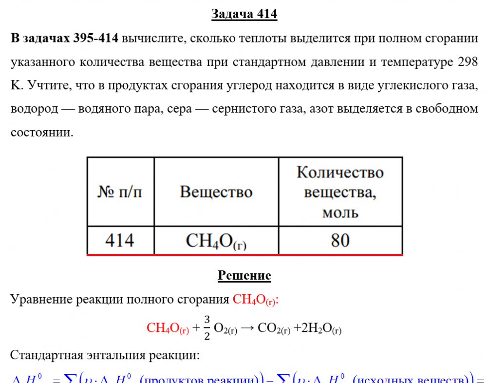 Задача 414 - вычислите, сколько теплоты выделится при полном сгорании указанного количества вещества при стандартном давлении и температуре 298 K. Учтите, что в продуктах50 сгорания углерод находится в виде углекислого газа, водород — водяного пара,