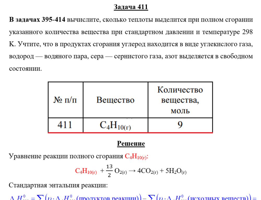 Задача 411 - вычислите, сколько теплоты выделится при полном сгорании указанного количества вещества при стандартном давлении и температуре 298 K. Учтите, что в продуктах50 сгорания углерод находится в виде углекислого газа, водород — водяного пара,