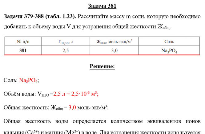 Задача 381: Задача 381 - Рассчитайте массу m соли, которую необходимо добавить к объему воды V для устранения общей жесткости Жобщ.