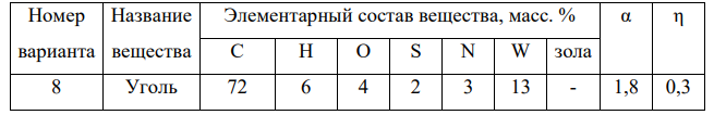 Пользуясь средними значениями теплоемкостей (табл. 19), рассчитать температуру горения горючего вещества (табл. 7), если горение протекает при коэффициенте избытка воздуха α (табл. 7), а доля потерь тепла излучением составляет η (табл. 7).