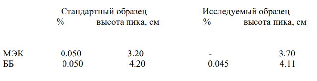 При определении метилэтилкетона (МЭК) в смеси методом газовой хромотографии в качестве внутреннего стандарта использовали третбутилбензол (ББ). Рассчитать процентное содержание МЭК в пробе, если по хроматограммам стандартного и исследуемого образцов получили следующие данные: