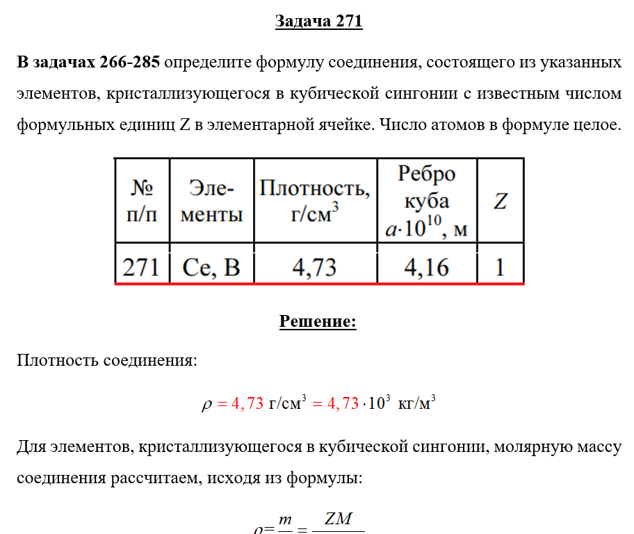 Для студентов по предмету ХимияЗадача 271 - определите формулу соединения, состоящего из указанных элементов, кристаллизующегося в кубической сингонии с известным числом формульных Задача 271 - определите формулу соединения, состоящего из указанных элементов, кристаллизующегося в кубической сингонии с известным числом формульных