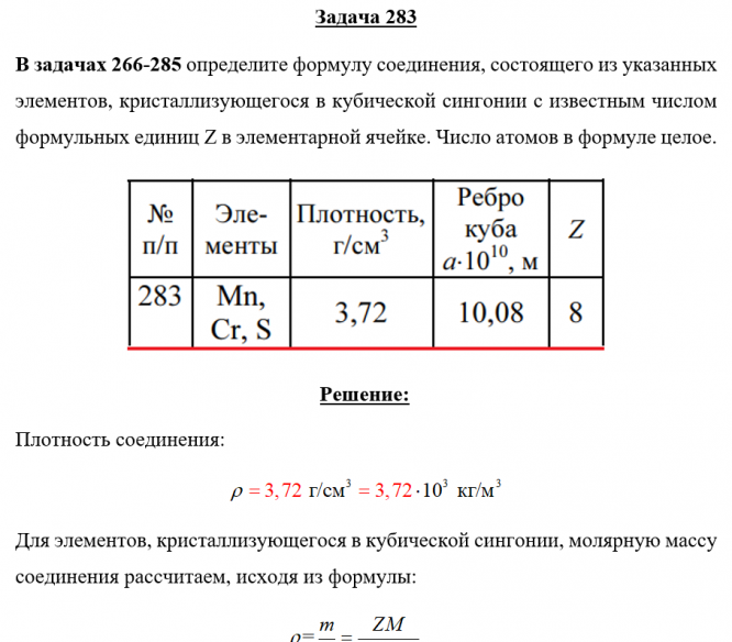 Для студентов по предмету ХимияЗадача 283 - определите формулу соединения, состоящего из указанных элементов, кристаллизующегося в кубической сингонии с известным числом формульных Задача 283 - определите формулу соединения, состоящего из указанных элементов, кристаллизующегося в кубической сингонии с известным числом формульных