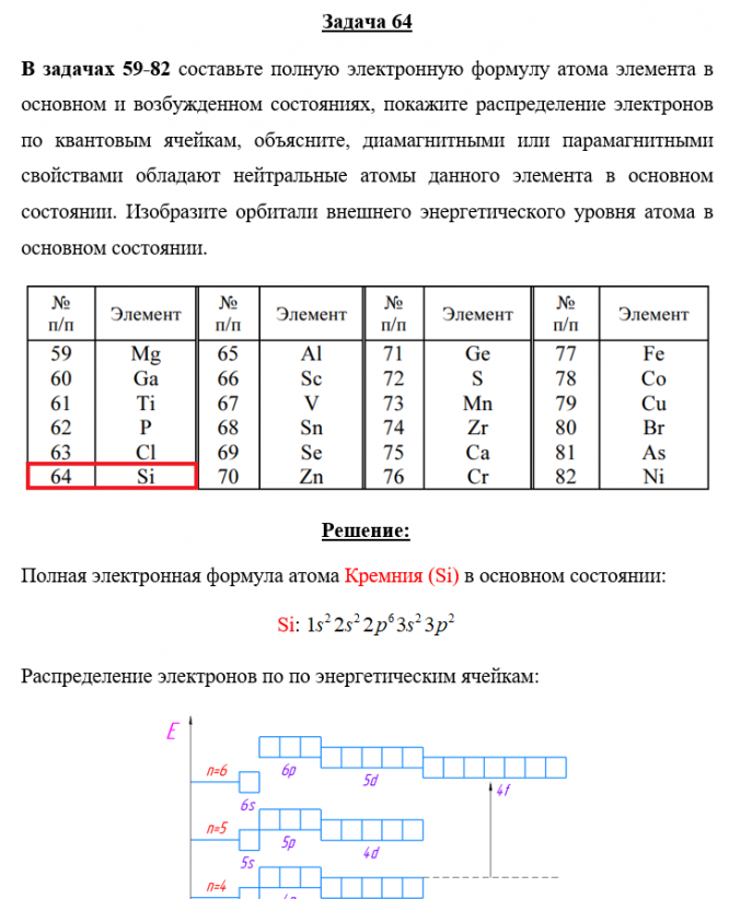 Задача 64 - составьте полную электронную формулу атома элемента в основном и возбужденном состояниях, покажите распределение электронов по квантовым ячейкам, объясните, диамагнитными или парамагнитными свойствами обладают нейтральные атомы данного эл