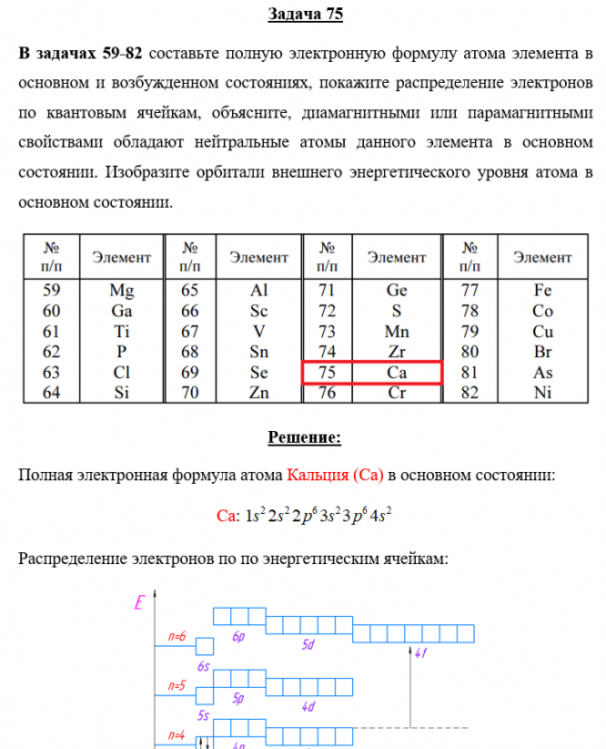 Задача 75 - составьте полную электронную формулу атома элемента в основном и возбужденном состояниях, покажите распределение электронов по квантовым ячейкам, объясните, диамагнитными или парамагнитными свойствами обладают нейтральные атомы данного эл