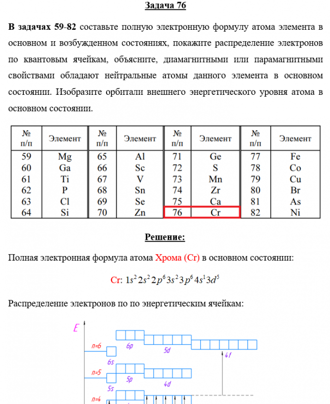 Задача 76 - составьте полную электронную формулу атома элемента в основном и возбужденном состояниях, покажите распределение электронов по квантовым ячейкам, объясните, диамагнитными или парамагнитными свойствами обладают нейтральные атомы данного эл