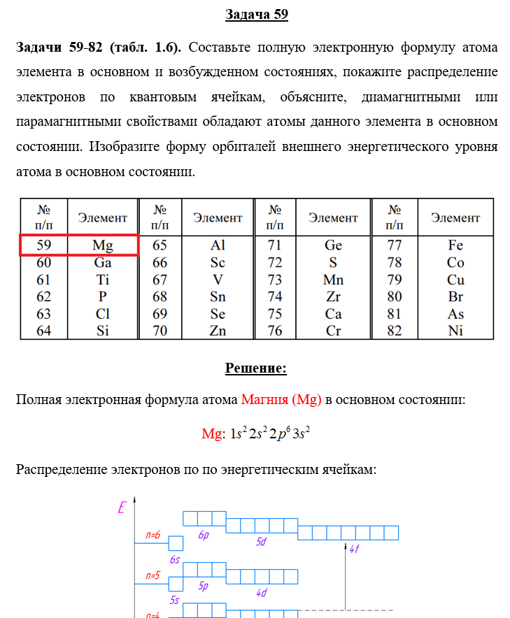 Задача 59 - Составьте полную электронную формулу атома элемента в основном и возбужденном состояниях, покажите распределение электронов по квантовым ячейкам, объясните, диамагнитными или парамагнитными свойствами обладают атомы данного элемента в осн