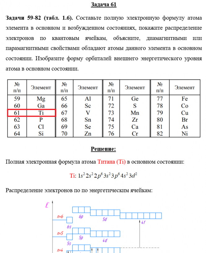 Задача 61 - Составьте полную электронную формулу атома элемента в основном и возбужденном состояниях, покажите распределение электронов по квантовым ячейкам, объясните, диамагнитными или парамагнитными свойствами обладают атомы данного элемента в осн