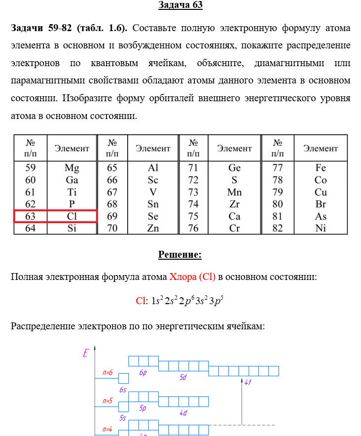 Задача 63 - Составьте полную электронную формулу атома элемента в основном и возбужденном состояниях, покажите распределение электронов по квантовым ячейкам, объясните, диамагнитными или парамагнитными свойствами обладают атомы данного элемента в осн