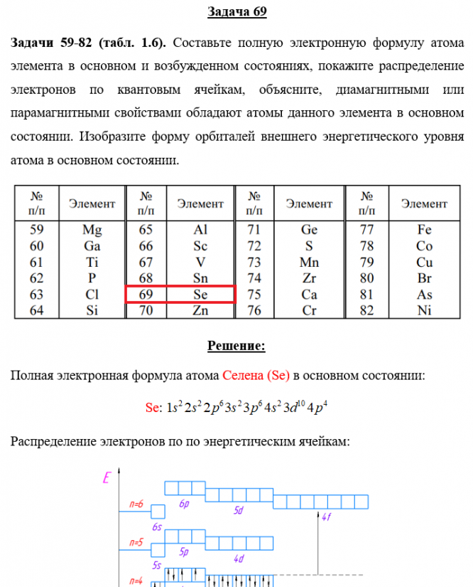 Задача 69 - Составьте полную электронную формулу атома элемента в основном и возбужденном состояниях, покажите распределение электронов по квантовым ячейкам, объясните, диамагнитными или парамагнитными свойствами обладают атомы данного элемента в осн