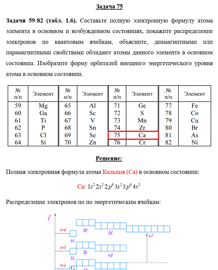 Задача 75 - Составьте полную электронную формулу атома элемента в основном и возбужденном состояниях, покажите распределение электронов по квантовым ячейкам, объясните, диамагнитными или парамагнитными свойствами обладают атомы данного элемента в осн