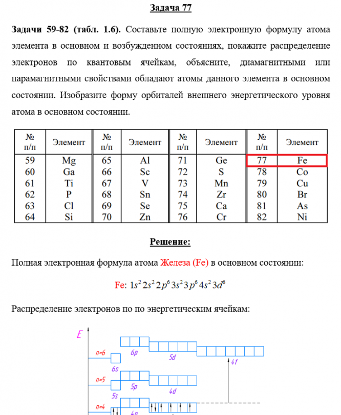 Задача 77 - Составьте полную электронную формулу атома элемента в основном и возбужденном состояниях, покажите распределение электронов по квантовым ячейкам, объясните, диамагнитными или парамагнитными свойствами обладают атомы данного элемента в осн