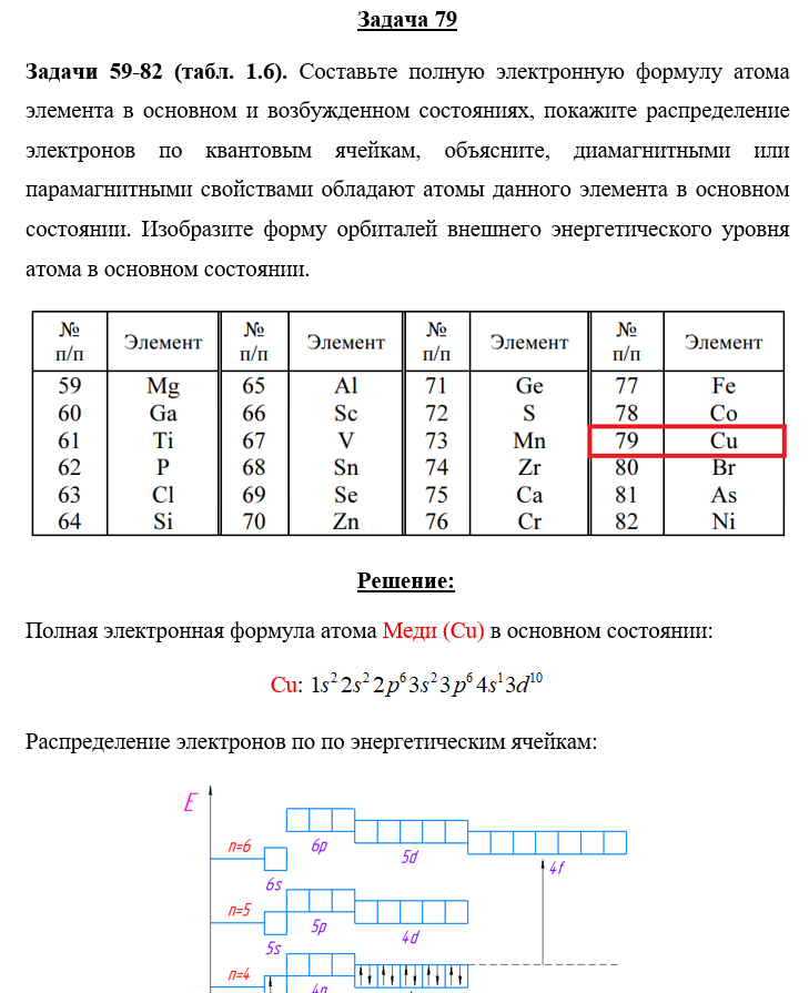 Задача 79 - Составьте полную электронную формулу атома элемента в основном и возбужденном состояниях, покажите распределение электронов по квантовым ячейкам, объясните, диамагнитными или парамагнитными свойствами обладают атомы данного элемента в осн