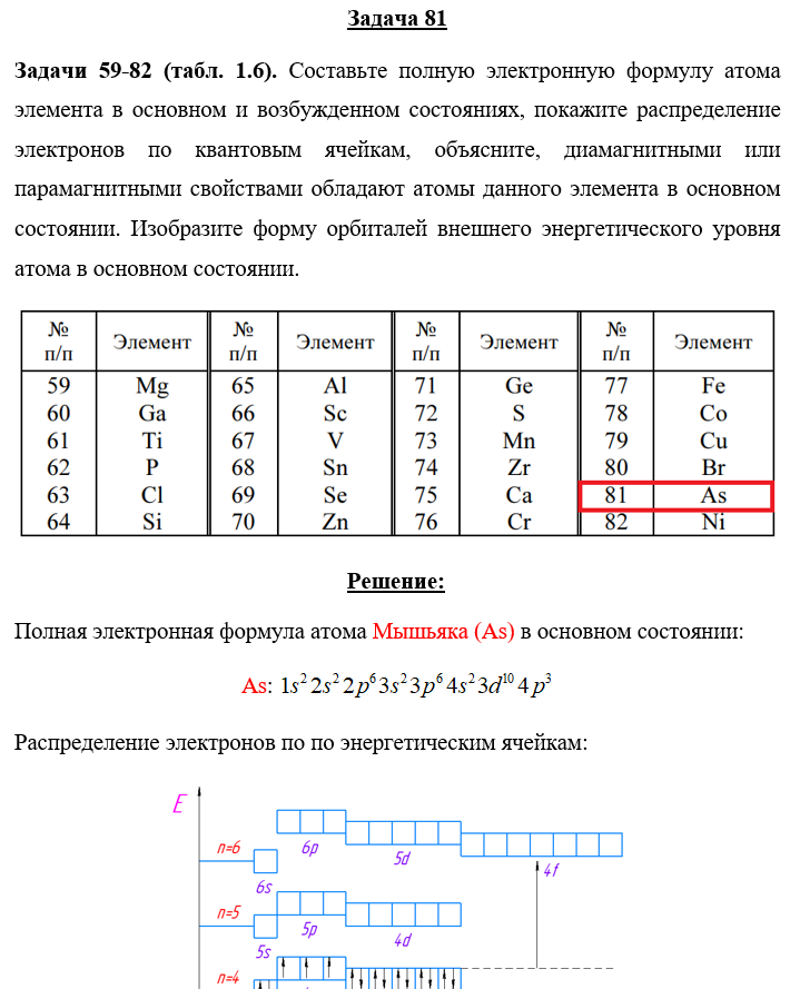 Задача 81 - Составьте полную электронную формулу атома элемента в основном и возбужденном состояниях, покажите распределение электронов по квантовым ячейкам, объясните, диамагнитными или парамагнитными свойствами обладают атомы данного элемента в осн