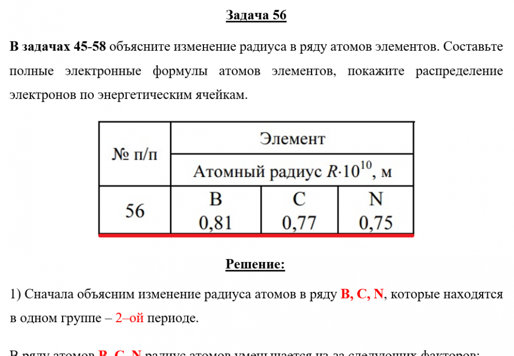 Задача 56 - объясните изменение радиуса в ряду атомов элементов. Составьте полные электронные формулы атомов элементов, покажите распределение электронов по энергетическим ячейкам.