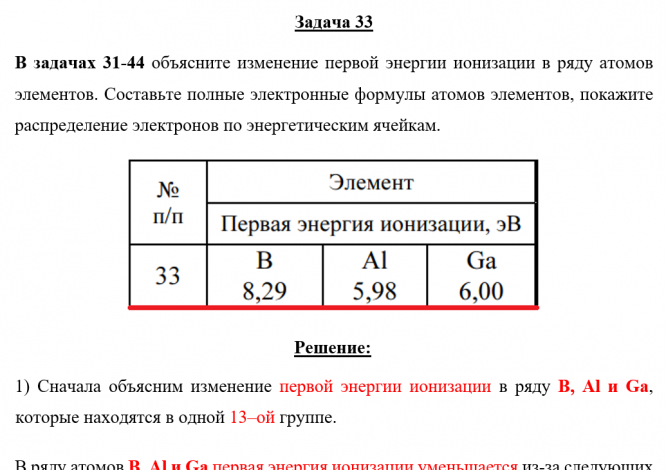 Задача 33 - объясните изменение первой энергии ионизации в ряду атомов элементов. Составьте полные электронные формулы атомов элементов, покажите распределение электронов по энергетическим ячейкам.