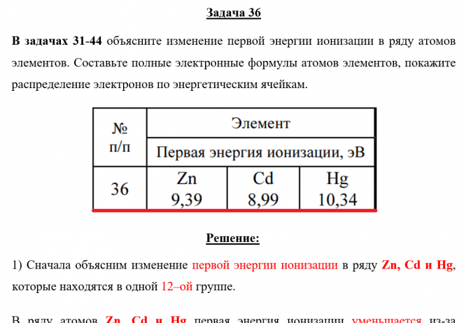 Задача 36 - объясните изменение первой энергии ионизации в ряду атомов элементов. Составьте полные электронные формулы атомов элементов, покажите распределение электронов по энергетическим ячейкам.