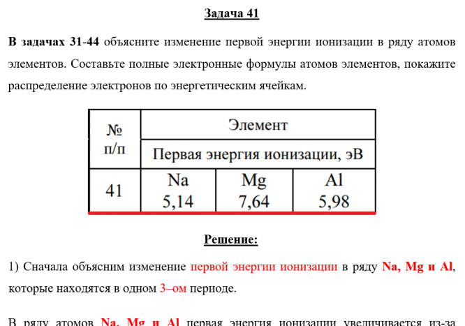 Задача 41 - объясните изменение первой энергии ионизации в ряду атомов элементов. Составьте полные электронные формулы атомов элементов, покажите распределение электронов по энергетическим ячейкам.