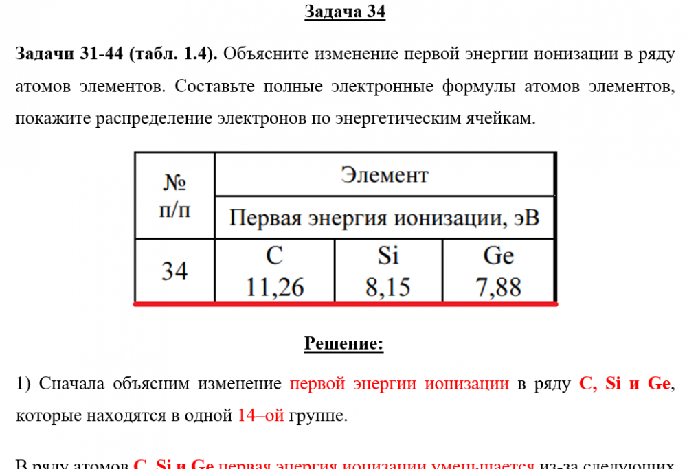 Задача 34 - Объясните изменение первой энергии ионизации в ряду атомов элементов. Составьте полные электронные формулы атомов элементов, покажите распределение электронов по энергетическим ячейкам.