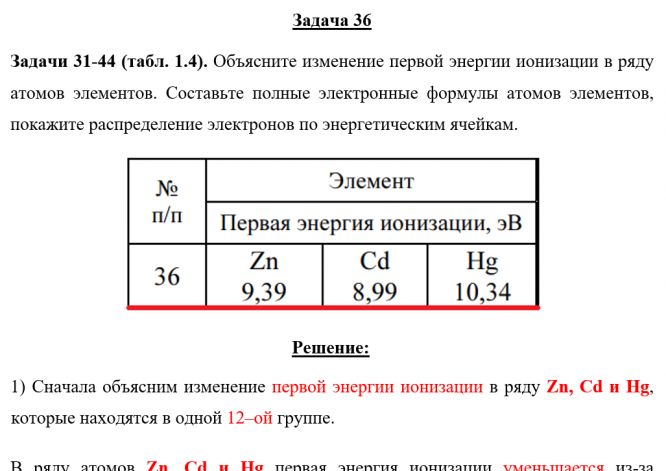 Задача 36 - Объясните изменение первой энергии ионизации в ряду атомов элементов. Составьте полные электронные формулы атомов элементов, покажите распределение электронов по энергетическим ячейкам.