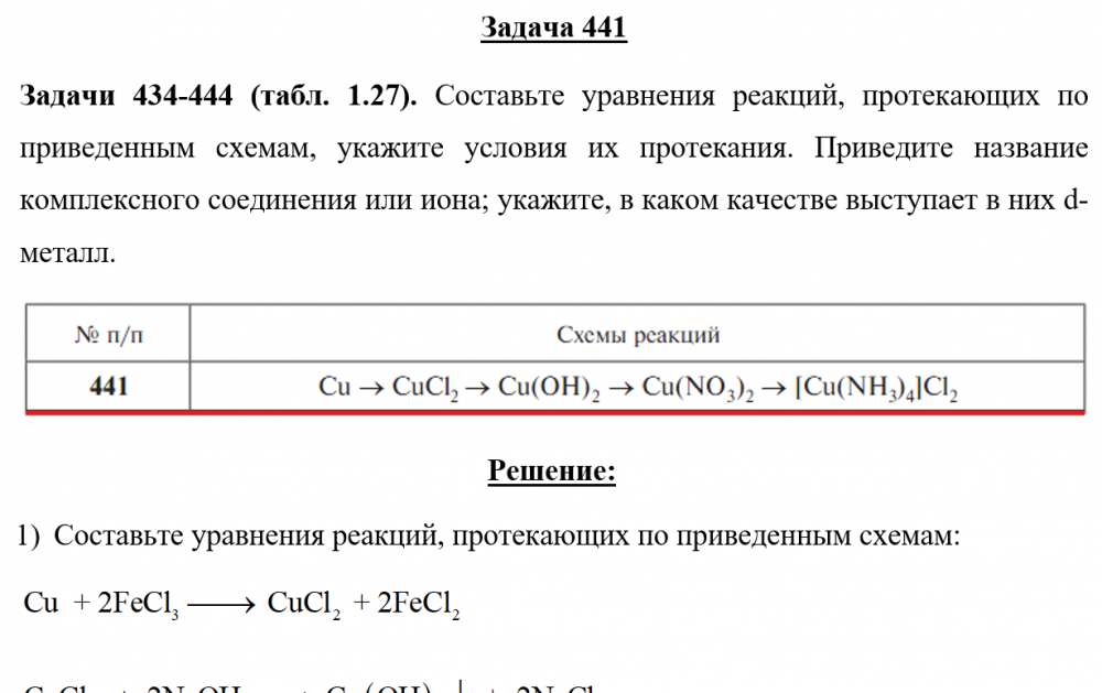 Показать/скрыть дополнительное описаниеЗадачи 434-444 (табл. 1.27). Составьте уравнения реакций, протекающих по приведенным схемам, укажите условия их протекания. Приведите название комплексного соединения или иона; укажите, в каком качестве выступает в них d-металл..
