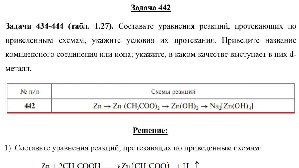 Показать/скрыть дополнительное описаниеЗадачи 434-444 (табл. 1.27). Составьте уравнения реакций, протекающих по приведенным схемам, укажите условия их протекания. Приведите название комплексного соединения или иона; укажите, в каком качестве выступает в них d-металл..