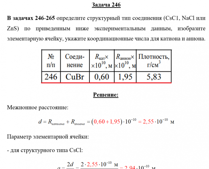 Задача 246 - определите структурный тип соединения (СsС1, NaCl или ZnS) по приведенным ниже экспериментальным данным, изобразите элементарную ячейку, укажите координационные числа для катиона и аниона.