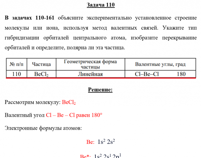 Задача 110 - объясните экспериментально установленное строение молекулы или иона, используя метод валентных связей. Укажите тип гибридизации орбиталей центрального атома, изобразите перекрывание орбиталей и определите, полярна ли эта частица.