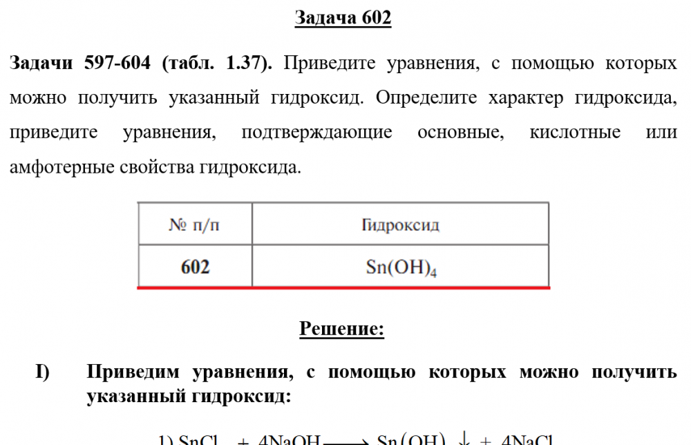 Задачи 597-604 (табл. 1.37). Приведите уравнения, с помощью которых можно получить указанный гидроксид. Определите характер гидроксида, приведите уравнения, подтверждающие основные, кислотные или амфотерные свойства гидроксида. ![]()