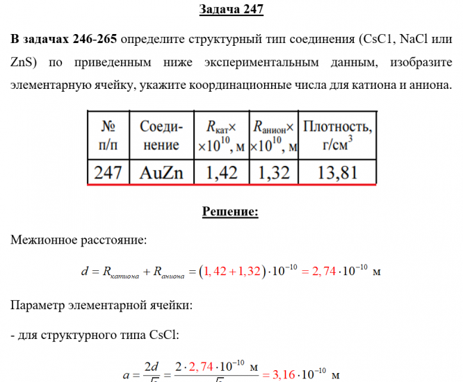 Задача 247 - определите структурный тип соединения (СsСl, NaCl или ZnS) по приведенным ниже экспериментальным данным, изобразите элементарную ячейку, укажите координационные числа для катиона и аниона.