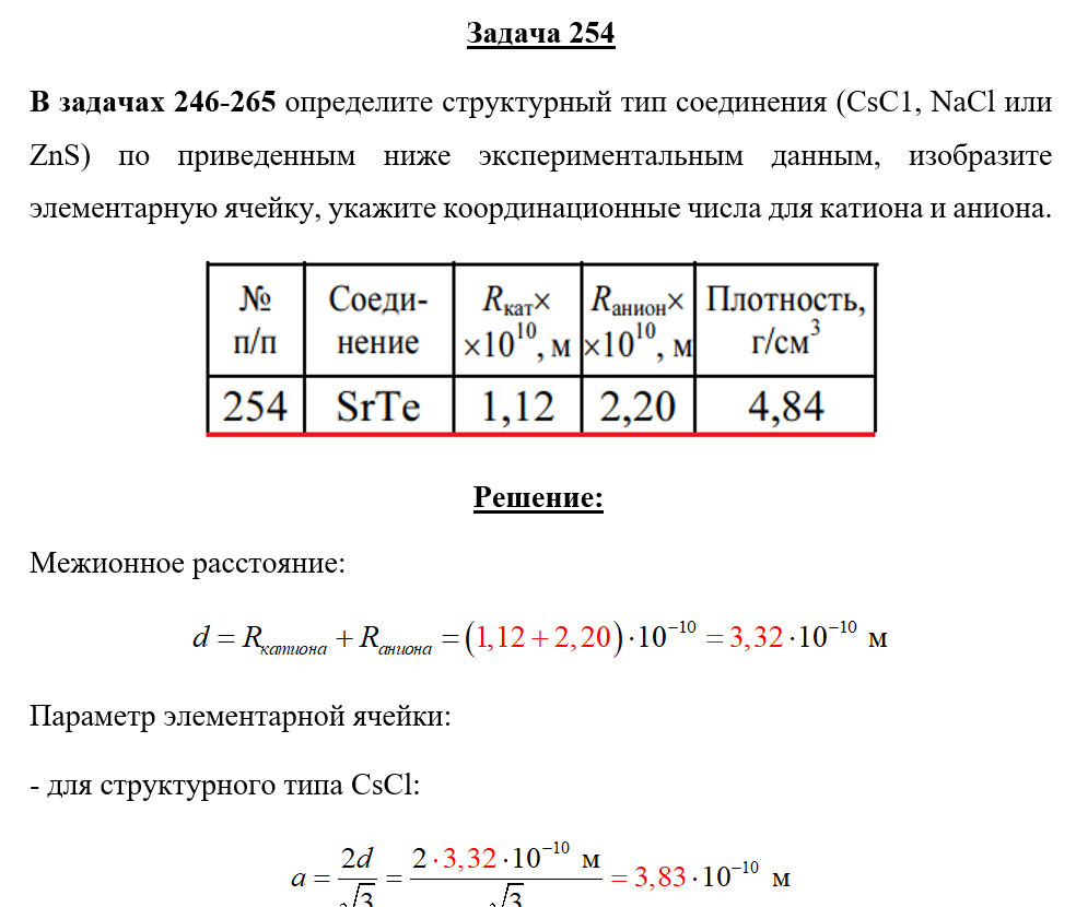 Задача 254 - определите структурный тип соединения (СsСl, NaCl или ZnS) по приведенным ниже экспериментальным данным, изобразите элементарную ячейку, укажите координационные числа для катиона и аниона.