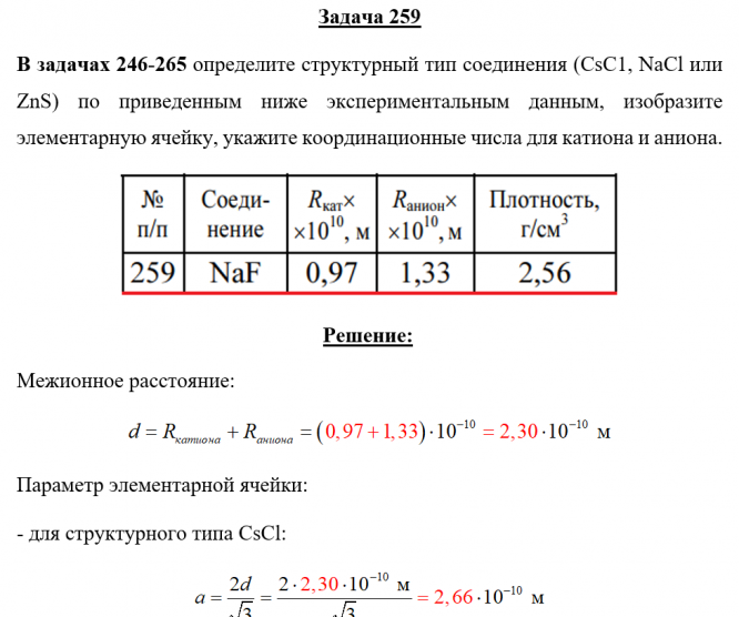 Задача 259 - определите структурный тип соединения (СsСl, NaCl или ZnS) по приведенным ниже экспериментальным данным, изобразите элементарную ячейку, укажите координационные числа для катиона и аниона.