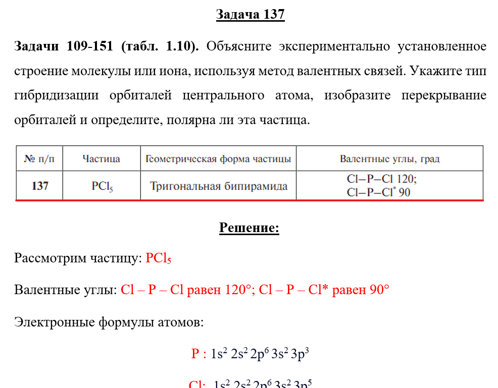 Задачи 109-151 (табл. 1.10). Объясните экспериментально установленное строение молекулы или иона, используя метод валентных связей. Укажите тип гибридизации орбиталей центрального атома, изобразите перекрывание орбиталей и определите, полярна ли эта частица..