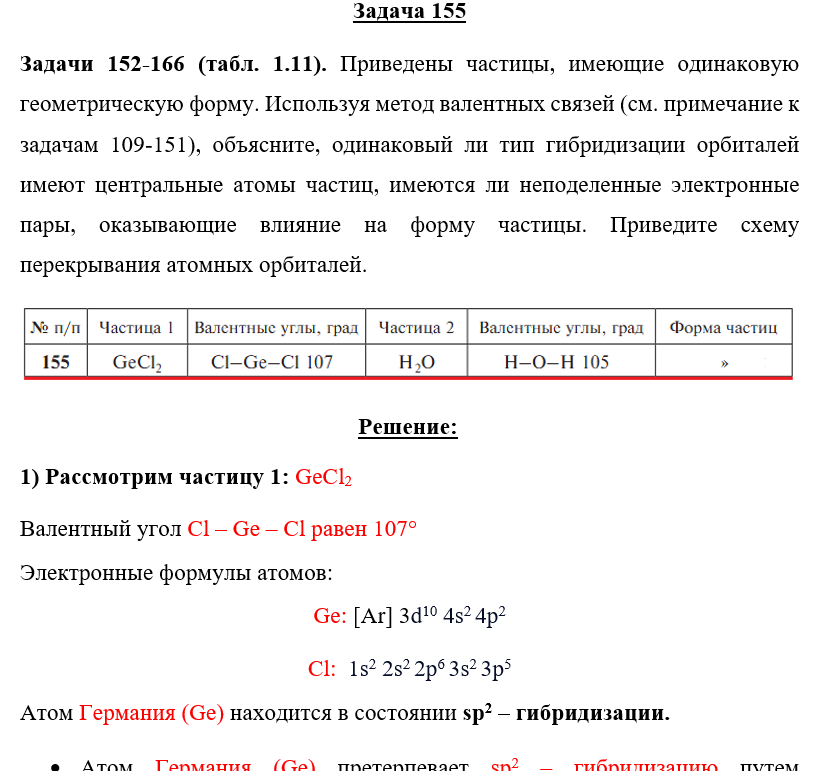 Главная » Учебные материалы » Химия » Решения задач » Несколько классов/семестров » Номер 155 » Задача 155 - Приведены частицы, имеющие одинаковую геометрическую форму. Используя метод валентных связей (см. примечание к задачам 109-151), объясните, одинаковый ли тип гибридизации орбиталей имеют центральные атомы частиц, имеются ли неподеленные