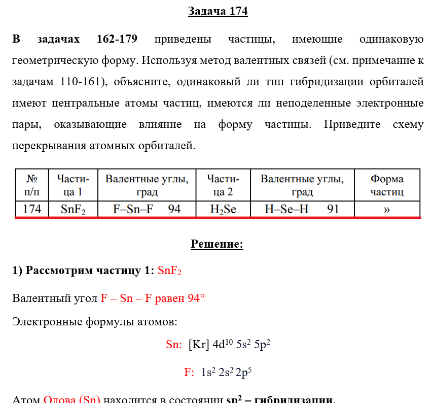 В задачах 162-179 приведены частицы, имеющие одинаковую геометрическую форму. Используя метод валентных связей (см. примечание к задачам 110-161), объясните, одинаковый ли тип гибридизации орбиталей имеют центральные атомы частиц, имеются ли неподеленные электронные пары, оказывающие влияние на форму частицы. Приведите схему перекрывания атомных орбиталей.