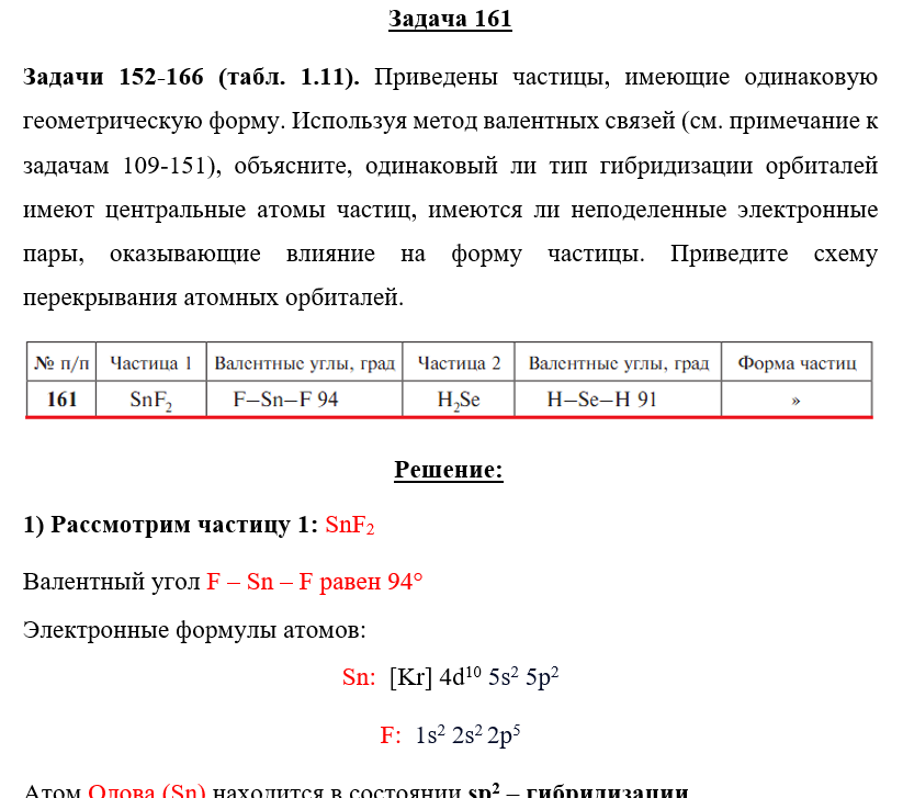 Задачи 152-166 (табл. 1.11). Приведены частицы, имеющие одинаковую геометрическую форму. Используя метод валентных связей (см. примечание к задачам 109-151), объясните, одинаковый ли тип гибридизации орбиталей имеют центральные атомы частиц, имеются ли неподеленные электронные пары, оказывающие влияние на форму частицы. Приведите схему перекрывания атомных орбиталей..