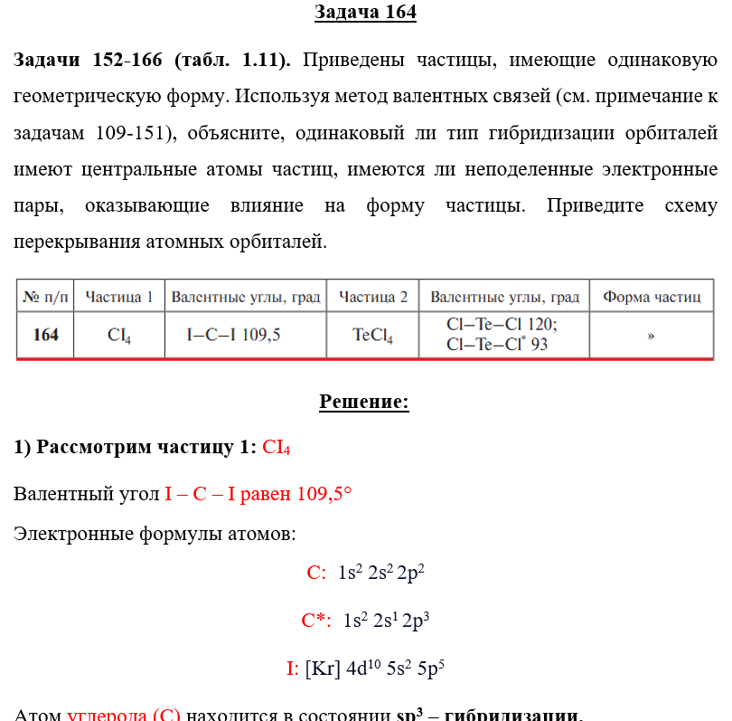 Задачи 152-166 (табл. 1.11). Приведены частицы, имеющие одинаковую геометрическую форму. Используя метод валентных связей (см. примечание к задачам 109-151), объясните, одинаковый ли тип гибридизации орбиталей имеют центральные атомы частиц, имеются ли неподеленные электронные пары, оказывающие влияние на форму частицы. Приведите схему перекрывания атомных орбиталей..