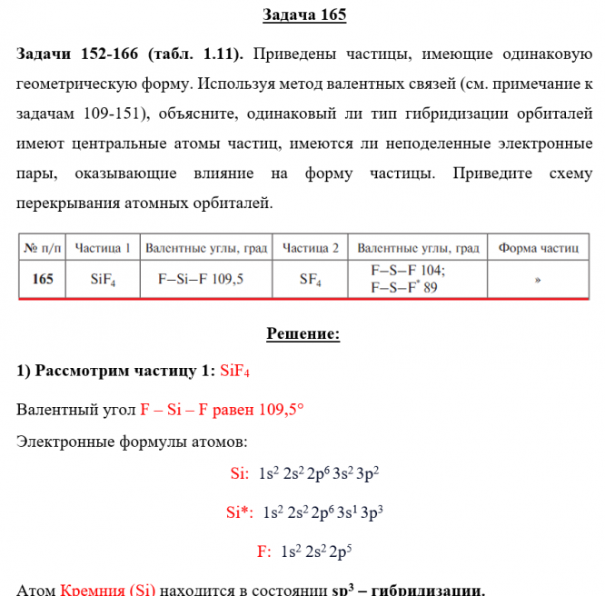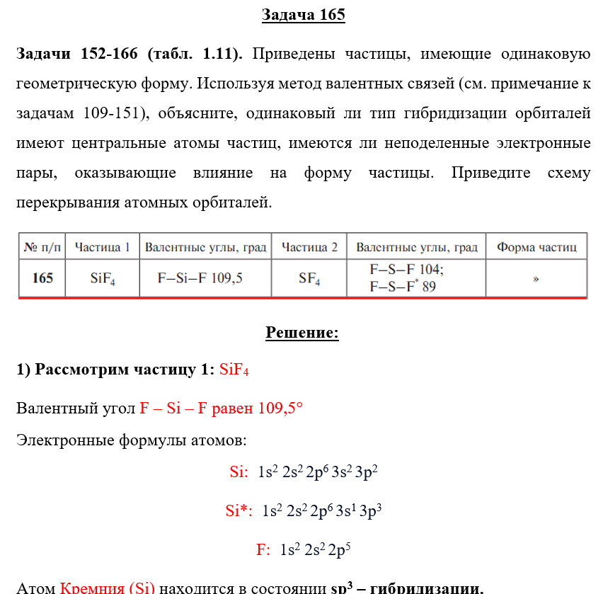 Задачи 152-166 (табл. 1.11). Приведены частицы, имеющие одинаковую геометрическую форму. Используя метод валентных связей (см. примечание к задачам 109-151), объясните, одинаковый ли тип гибридизации орбиталей имеют центральные атомы частиц, имеются ли неподеленные электронные пары, оказывающие влияние на форму частицы. Приведите схему перекрывания атомных орбиталей..
