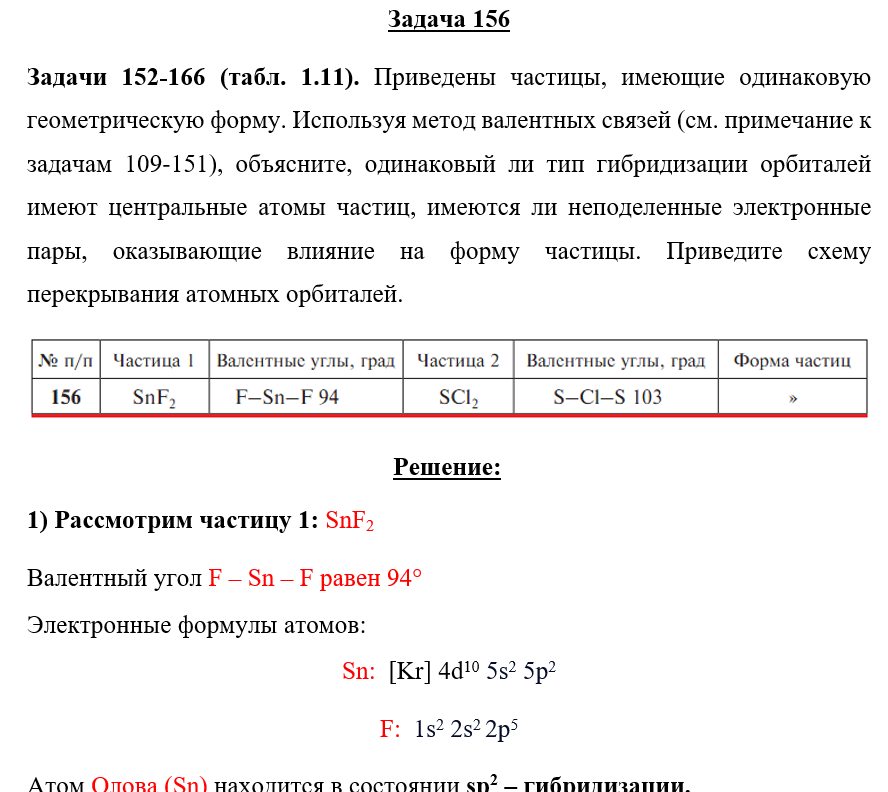 Задачи 152-166 (табл. 1.11). Приведены частицы, имеющие одинаковую геометрическую форму. Используя метод валентных связей (см. примечание к задачам 109-151), объясните, одинаковый ли тип гибридизации орбиталей имеют центральные атомы частиц, имеются ли неподеленные электронные пары, оказывающие влияние на форму частицы. Приведите схему перекрывания атомных орбиталей..