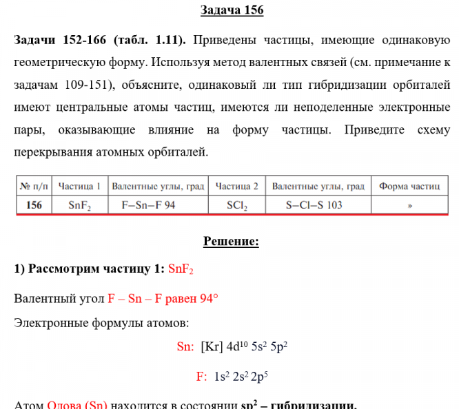 Задачи 152-166 (табл. 1.11). Приведены частицы, имеющие одинаковую геометрическую форму. Используя метод валентных связей (см. примечание к задачам 109-151), объясните, одинаковый ли тип гибридизации орбиталей имеют центральные атомы частиц, имеются ли неподеленные электронные пары, оказывающие влияние на форму частицы. Приведите схему перекрывания атомных орбиталей.