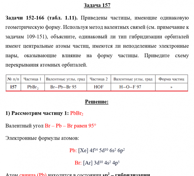 Задачи 152-166 (табл. 1.11). Приведены частицы, имеющие одинаковую геометрическую форму. Используя метод валентных связей (см. примечание к задачам 109-151), объясните, одинаковый ли тип гибридизации орбиталей имеют центральные атомы частиц, имеются ли неподеленные электронные пары, оказывающие влияние на форму частицы. Приведите схему перекрывания атомных орбиталей.